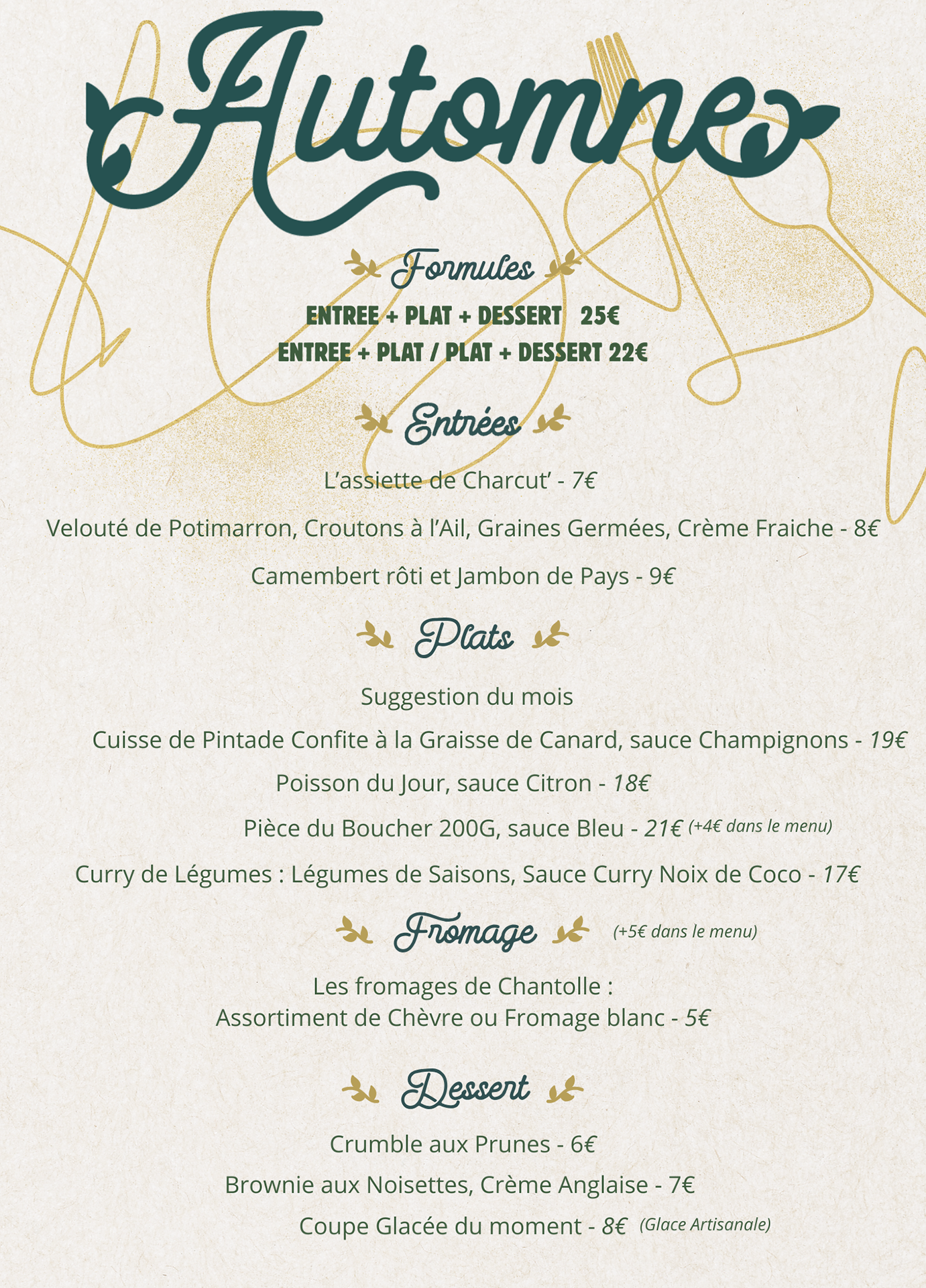 Pour s’adapter au mieux aux saisons et à la disponibilité des produits frais, nous vous proposons une carte unique qui se renouvelle avec les produits et les envies du moment.